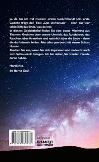 Ja, da bin ich mit meinem ersten Gedichtband! Das erste Gedicht trägt den Titel „Das Universum“ – denn das war schließlich das Erste, was da war. In diesem Gedichtband finden Sie eine bunte Mischung aus Themen: Gedichte über unsere Umwelt, das Autofahren, das Rauchen, über Krankheit und natürlich über die Liebe – denn die darf niemals fehlen. Also alles querbeet mit einem Schuss Humor.