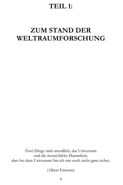 Den inhaltlichen Schwerpunkt des Buchs bildet der dritte Teil, in dem ein Gedankenaustausch mit einem Philosophen und einem Psychologen zu den noch offenen Fragen der Weltraumforschung geführt und dabei insbesondere der Frage nachgegangen wird, aus welchen Gründen sich Menschen mit dem unendlichen und fernen All befassen.