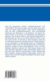 Sind die Deutschen wirklich ''politikverdrossen'' und ''wahlmüde''? Mit seinem Essay will der Autor eine Antwort auf diese Frage geben. Nach seiner Auffassung sind sie eher ''politikerverdrossen''. Das schwindende Vertrauen der Menschen in die Parteien und deren Politiker macht er an Hand von Statistiken und Beispielen deutlich. Als Ursache sieht er das aktuelle Wahlrecht in Deutschland an, das er auf allen Ebenen kritisch unter die Lupe nimmt. Er kommt zu dem Ergebnis, dass bis auf wenige Ausnahmen die Mehrzahl der ''Volksvertreter'' in den Landtagen, im Bundestag sowie im Europäischen Parlament eben nicht von den Bürgerinnen und Bürgern gewählt, sondern hinter verschlossenen Türen von den Parteien bestimmt werden. Im Titel dieses Essays sind Willy Brandts legendäres ''Mehr Demokratie wagen'' und das Ziel einer Bremer Volksinitiative ''Mehr Demokratie beim Wählen'' programmatisch miteinander vereint. Mit diesem Buch soll eine längst überfällige Diskussion angestoßen werden.