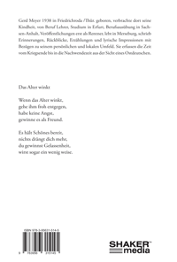 Gerd Meyer 1938 in Friedrichroda /Thür. geboren, verbrachte dort seine Kindheit, von Beruf Lehrer, Studium in Erfurt, Berufsausübung in Sachsen-Anhalt, Veröffentlichungen erst als Rentner, lebt in Merseburg, schrieb Erinnerungen, Rückblicke, Erzählungen und lyrische Impressionen mit Bezügen zu seinem persönlichen und lokalen Umfeld. Sie erfassen die Zeit vom Kriegsende bis in die Nachwendezeit aus der Sicht eines Ostdeutschen.