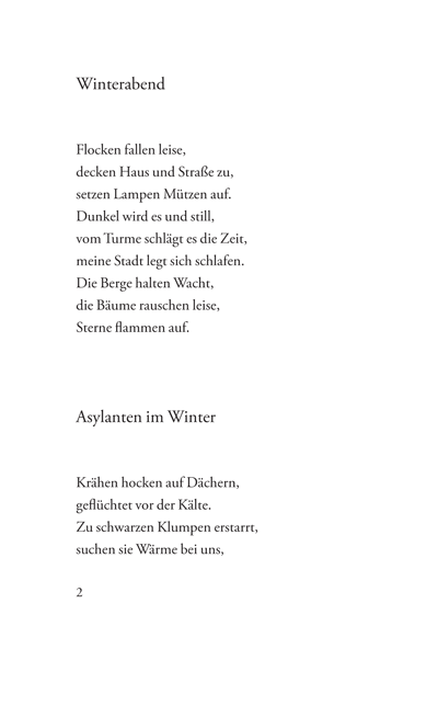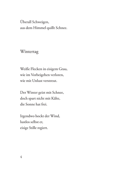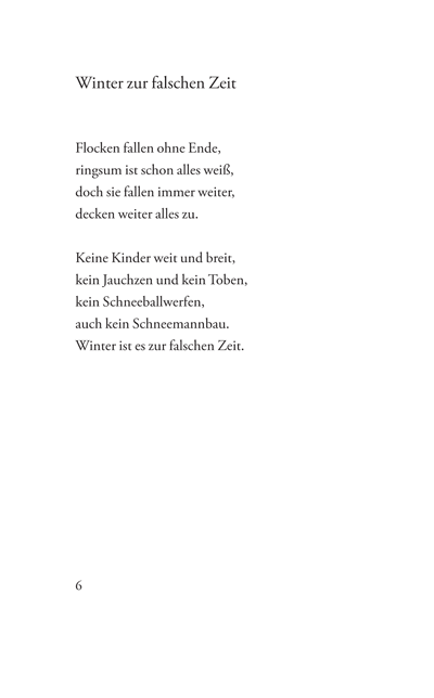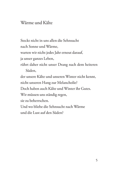 Zwei Themen behandelt der Autor in seinen lyrischen Impressionen, kurzen gedichtähnlichen Texten. Im „Gang durch ein Jahr“ führt er durch die Jahreszeiten, in „Das Alter winkt“ zeigt er Befindlichkeiten und Sichtweisen im Alter. Dabei ergeben sich zahlreiche Zusammenhänge zwischen beiden Themen.